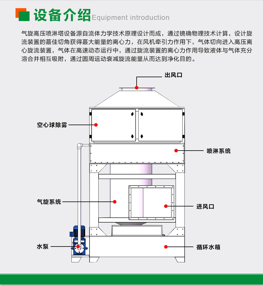 含塵含味氣體通過吸氣罩收集,在風機的作用下,經(jīng)過管道輸送負壓進入雙級氣旋噴淋塔。氣旋混流裝置快速運轉(zhuǎn),多級連續(xù)的凈化使得含塵含味氣體與水霧充份混合,在離心的作用下達到氣液分離。氣旋桶內(nèi)部采用水泵循環(huán)給水,水在水箱經(jīng)水泵增壓后自螺旋噴嘴霧化而出,最后回流至水箱循環(huán)使用。分離出來的雜物下沉到水箱底部,經(jīng)凈化后的氣體進入填料隔水層,然后由風機排出。