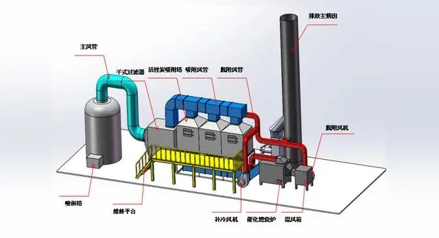 系統(tǒng)由5個活性炭吸附箱(4用1備),1個催化燃燒床構(gòu)成,將各條生產(chǎn)線中的所有排氣管合并連接引入凈化設(shè)備,各個支管上安裝一只手動調(diào)節(jié)閥,配比調(diào)節(jié)風(fēng)量;在吸附凈化裝置與廢氣進口之間安裝一套預(yù)處理干式過濾器,過濾少量的粉塵,從而避免活性炭微孔被堵塞,然后送入活性炭吸附箱進行吸附凈化,當(dāng)其中一活性炭吸附器接近飽和時,系統(tǒng)將自動切換到備用活性炭吸附箱(此時飽和活性炭吸附箱停止吸附操作),然后用熱氣流對飽和活性炭吸附箱進行解吸脫附,將有機物從活性炭上脫附下來。在脫附過程中,有機廢氣已被濃縮,濃度后的濃度較原濃度提高幾十倍,達2000ppm以上,濃縮廢氣送到催化燃燒裝置,之后被分解成CO2與H2O排出。完成解吸脫附后,活性炭吸附器進入待用狀態(tài),待其他活性炭吸附箱接近飽和時,系統(tǒng)再自動切換回來,同時對飽和活性炭吸附器進行解吸脫附,如此循環(huán)工作。之后凈化后的潔凈氣體由主排風(fēng)機排入大氣中。