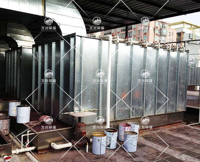 均勻安裝多層濕簾層和過濾層。水性過濾棉,不吸水,漆粉附著表面時,會隨水流受重力作用被洗滌至循環(huán)水池,不易堵。濕簾層經(jīng)水洗后會在面上形成一層水膜,漆粉經(jīng)過該層被水膜黏附,對降低氣體流速,加長廢氣在噴淋塔的洗滌時間有重要作用。廢氣經(jīng)過除霧層(即氣水分離)后,再進行活性炭吸附塔吸附。該法具有處理效果高,運行穩(wěn)定優(yōu)點。