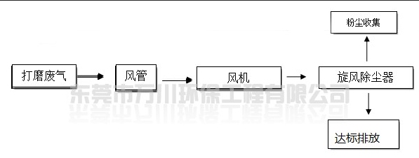 二樓的切削打磨屬于粉塵廢氣,打磨拋光時所產(chǎn)生的粉塵通過收集由引風(fēng)機抽至車間外。本方案設(shè)計設(shè)粉塵廢氣處理系統(tǒng)二套,處理能力為15000m3/h,系統(tǒng)設(shè)于車間一樓。