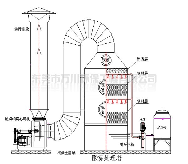 酸霧廢氣由風(fēng)管進入酸霧處理塔,自下而上穿過填料層;循環(huán)堿液吸收劑由塔頂通過螺旋噴嘴,形成的水霧勻地噴淋到填料層中,沿著填料層表面向下流動,進入循環(huán)水箱。由于上升氣流和下降霧化吸收劑(堿液)在填料中不斷接觸,上升氣體中流質(zhì)的濃度越來越低。使其酸霧得到凈化,達標排放。