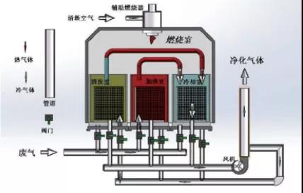 RTO把有機(jī)廢氣加熱到760攝氏度以上,使廢氣中的VOCs在氧化分解成二氧化碳和水。氧化產(chǎn)生的高溫氣體流經(jīng)特制的陶瓷蓄熱體,使陶瓷體升溫而蓄熱”,蓄熱用于預(yù)熱后續(xù)進(jìn)入的有機(jī)廢氣,從而節(jié)省廢氣升溫的燃料消耗。陶瓷蓄熱體應(yīng)分成三個(gè)(含三個(gè))以上的區(qū)或室,每個(gè)蓄熱室依次經(jīng)歷蓄熱-放熱-清掃等程序,周而復(fù)始,連續(xù)工作。蓄熱室放熱后應(yīng)立即引入部分已處理合格的潔凈排氣對(duì)該蓄熱室進(jìn)行清掃(以保證VOC去除率在99%以上),只有待清掃完成后才能進(jìn)入蓄熱程序。RTO蓄熱式廢氣處理設(shè)備,運(yùn)行費(fèi)用省,有機(jī)廢氣的處理效率高的優(yōu)點(diǎn),適應(yīng)廢氣濃度1000~10000mg/m3,分解效率:99%—99.5%。是目前較為經(jīng)濟(jì)可靠的達(dá)到50mg/m3嚴(yán)格的排放標(biāo)準(zhǔn)的VOCs治理技術(shù),得到了廣泛的應(yīng)用。